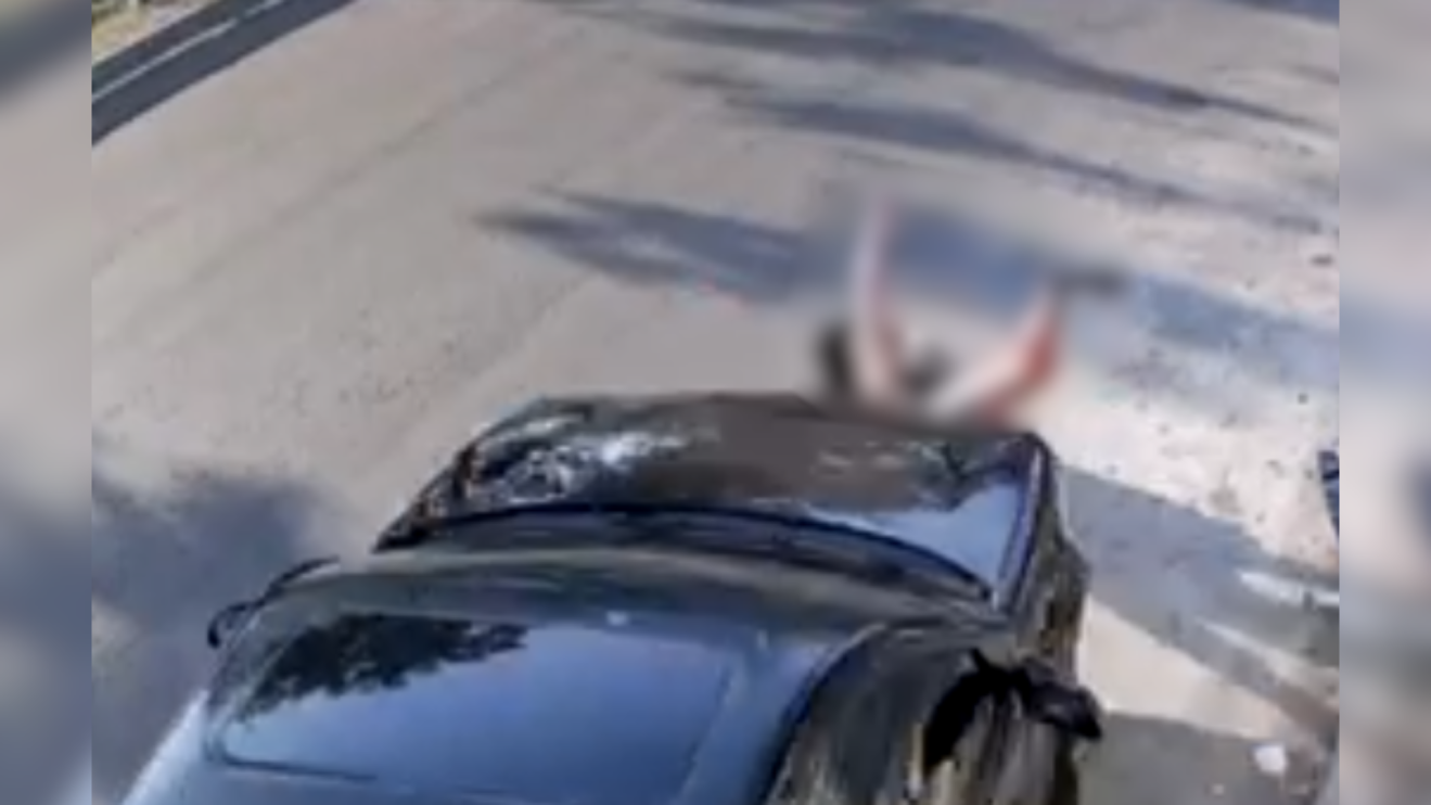 O motorista, identificado como Douglas Alves da Silva, de 26 anos, não só atropela, mas passa por cima da mulher com o carro e a arrasta pela rua.
