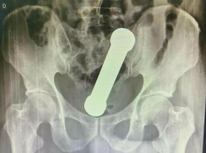 A partir do resultado do exame de radiografia, a equipe médica identificou um halter, utilizado em exercícios físicos, próximo ao reto do paciente. O homem então foi encaminhado ao centro cirúrgico e o objeto foi retirado de forma manual.