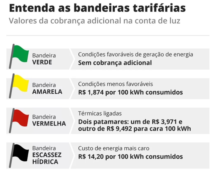 As bandeiras tarifárias são definidas mensalmente e são informadas na própria conta de luz. Se elas estiverem na cor verde, a tarifa não sofre nenhum acréscimo. Com a cor amarela, o aumento é de R$ 1,874 para cada 100 kWh consumidos no mês. Já na cor vermelha, o consumidor paga R$ 3,971 para cada 100 kWh no patamar 1 e R$ 9,492 para cada 100 kWh no patamar 2. Na escassez hídrica, é cobrado R$ 14,20 para cada 100 kWh.