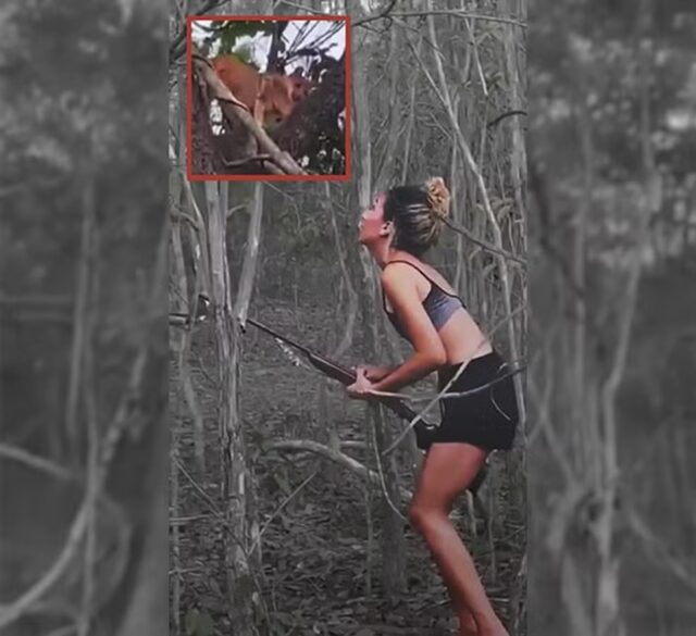 Na gravação, a mulher aparece com uma espécie de espingarda e atira no animal, que estava no alto de uma árvore.