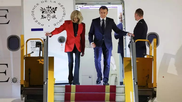 A imagem do presidente da França, Emmanuel Macron, tendo o rosto empurrado pela primeira-dama, Brigitte Macron, na noite de domingo (25), no momento do desembarque no Vietnã, chamou a atenção.