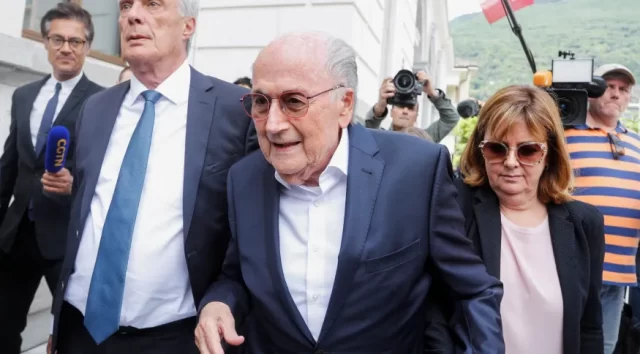 Blatter, parecendo frágil durante a audiência na Corte Criminal Federal em Bellinzona, disse que não poderia falar ao tribunal devido a dores no peito.