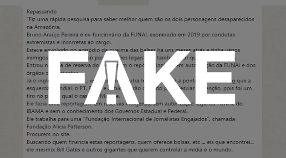A mensagem completa diz: “Repassando. Fiz uma rápida pesquisa para saber melhor quem são os dois personagens desaparecidos na Amazônia. Bruno Araújo Pereira é ex-funcionário da FUNAI, exonerado em 2019 por condutas extremistas e incorretas ao cargo. Esteve envolvido no episódio da queima das balsas há uns meses atrás e tinha vários inimigos na região, não só por questões legais mas também por questões pessoais. Entrou na área de reserva do Javari com o repórter inglês, sem autorização da FUNAI e dos órgãos competentes. Já o inglês Dom Philips… este tem uma outra história, que é a ponta de um iceberg que a esquerda mundial, o PT, PSOL e a mídia farão de tudo para desviar a atenção, pois foi um tiro no pé, tal qual o caso da Mariele. Ele fazia uma reportagem em reservas indígenas, sem autorização legal da FUNAI, do IBAMA e sem o conhecimento dos Governos Estadual e Federal. Ele trabalha para uma “Fundação Internacional de Jornalistas Engajados”, chamada Fundação Alicia Patterson. Procurem no site. Buscando quem financia estas reportagens, quem oferece bolsas, etc … eis que encontrei… ele mesmo: Bill Gates e outros gigantes que querem controlar a mídia e o mundo.”