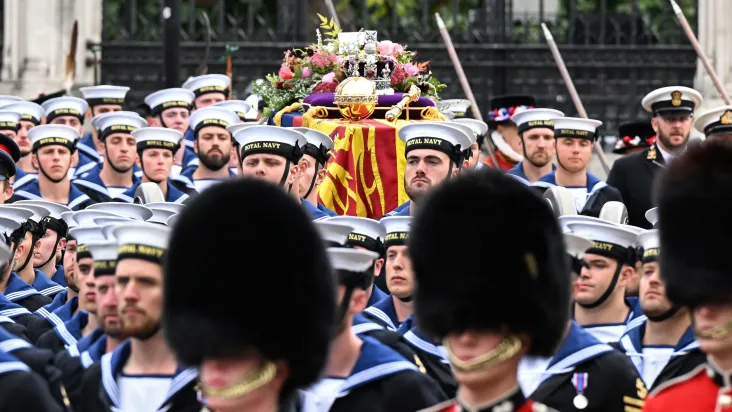 Após o funeral de estado, o caixão segue para o Arco de Wellington em um cortejo com a participação do rei Charles III e membros da família real.