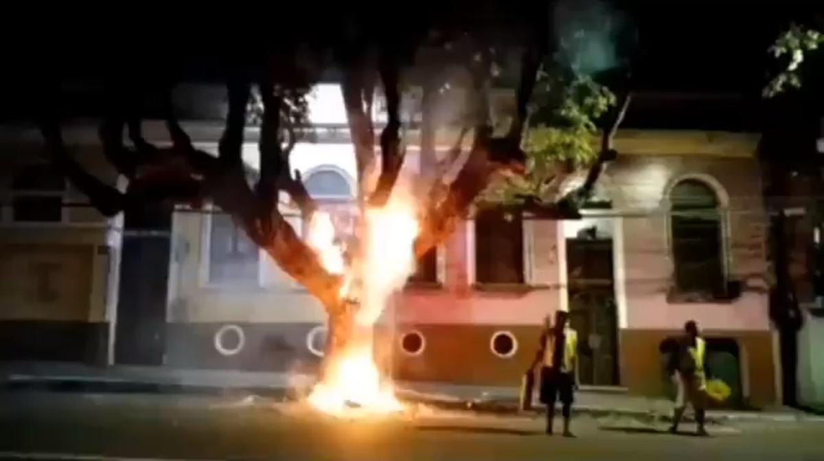 O vídeo que mostra a árvore em chamas, e dois flanelinhas tentando apagar o fogo.