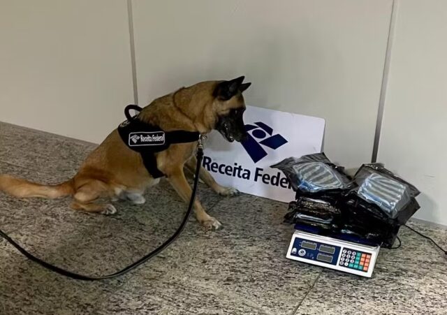 Os servidores da Receita Federal, diante da insistência dos cães de faro da presença de drogas, realizaram uma varredura no saguão de embarque, ação que identifica pessoas com drogas escondidas no corpo.
