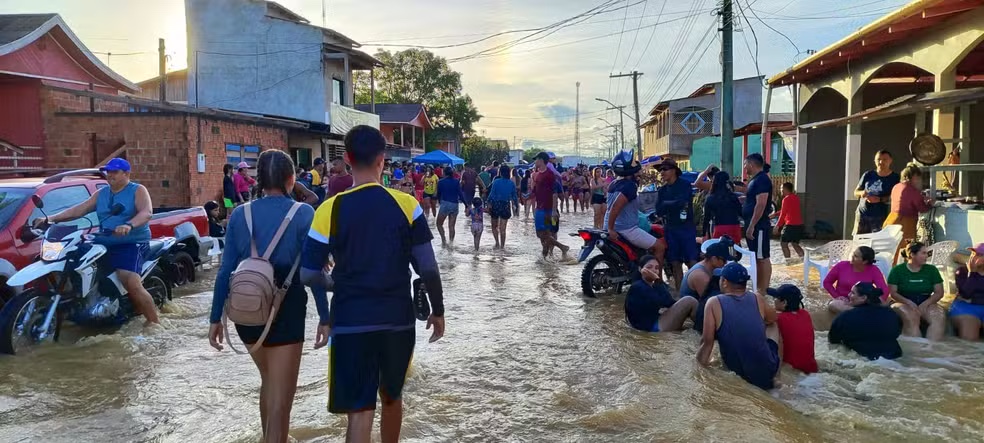 Após subida dos rios Acre e Purus, os moradores de Boca do Acre, no interior do Amazonas, transformaram as ruas da cidade em balneário a céu aberto. Em imagens que circulam nas redes sociais, é possível ver famílias realizando churrasco, além de carros de som, tendas e boias aquáticas pelas vias do município.