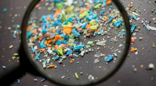 Microplásticos são fragmentos de polímeros que podem variar de menos de 0,2 polegada (5 milímetros) até 1/25.000 de polegada (1 micrômetro). Qualquer coisa menor é um nanoplástico que deve ser medido em bilionésimos de metro. Eles se formam quando plásticos maiores se degradam quimicamente ou se desgastam fisicamente em pedaços menores.