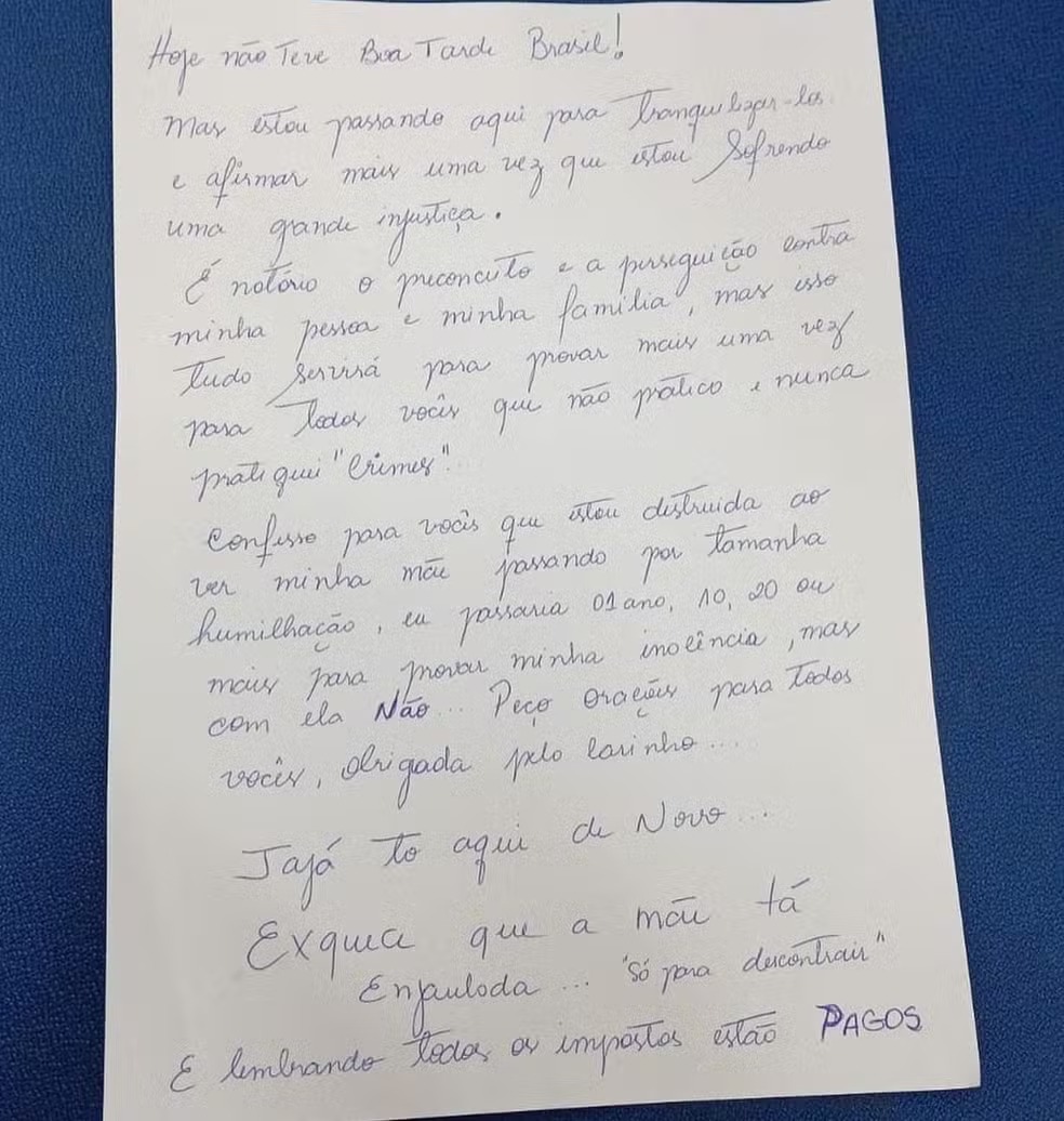 “Hoje não teve boa-tarde, Brasil! Mas estou passando aqui para tranquilizá-los e afirmar mais uma vez que estou sofrendo uma grande injustiça. É notório o preconceito e a perseguição contra minha pessoa e minha família, mas isso tudo servirá para provar mais uma vez para todos vocês que não prático e nunca pratiquei ‘crimes’.
