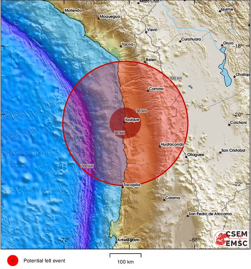 Um terremoto de magnitude 5,7 atingiu a região de Tarapacá, no Chile, na noite deste domingo (25), de acordo com o Centro Sismológico Euro-Mediterrânico (EMSC).