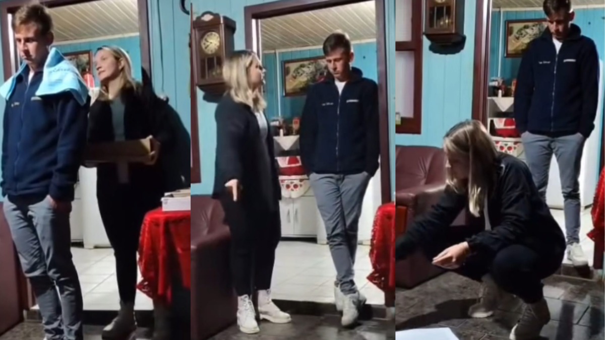 Em uma reunião de família, a mulher decidiu que faria a “surpresa” em frente aos familiares do companheiro, que segundo ela, já sabiam dos adultérios. No começo do vídeo, Natália pede para o companheiro ficar de costas.